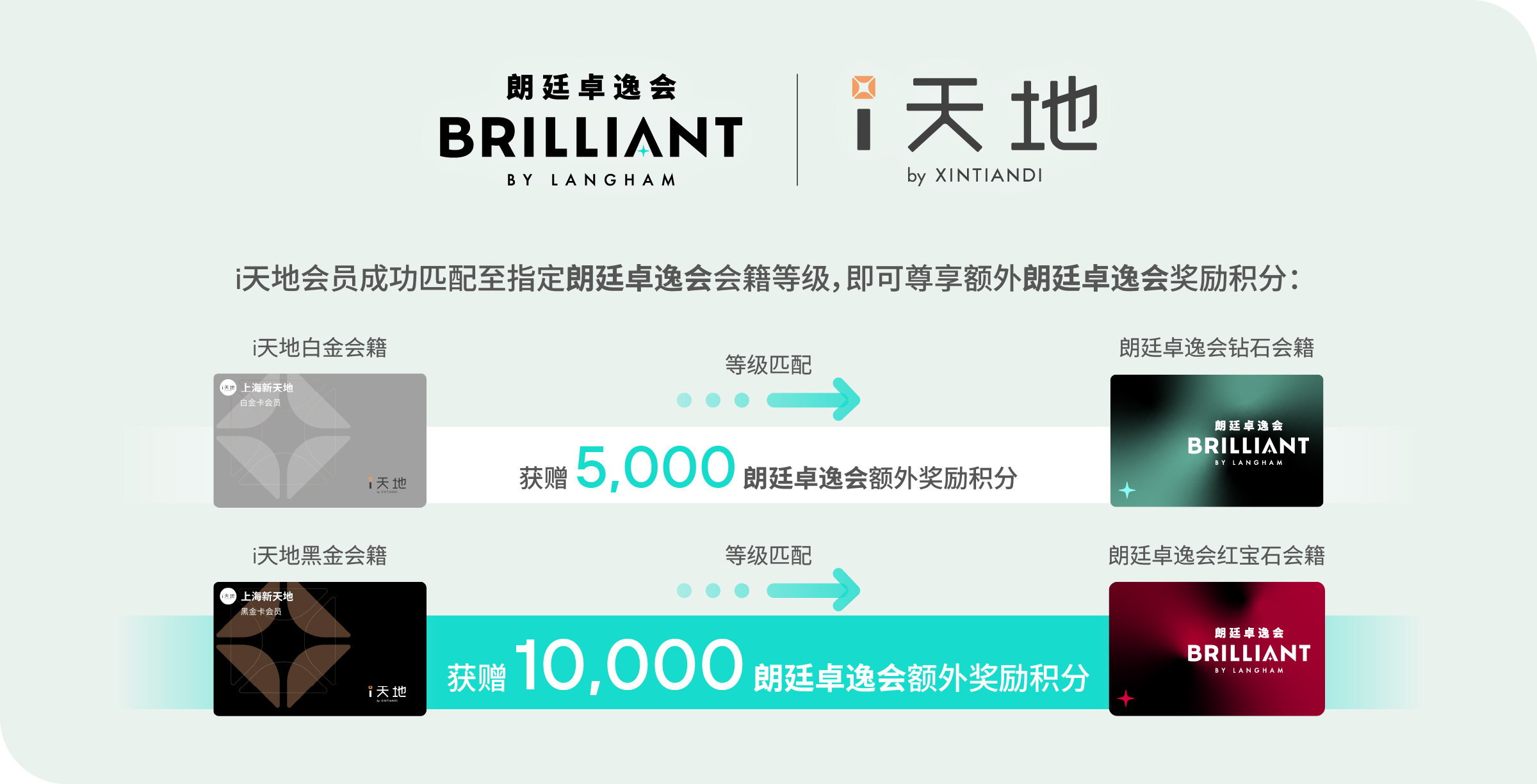 由2026年2月4日起至2026年12月31日期间,朗廷卓逸会会员可尊享i天地免费会籍升级及i天地积分礼遇。i天地的会员可享朗廷卓逸会会籍等级匹配礼遇,并尊享精彩的额外奖励积分及更多会员专属礼遇。