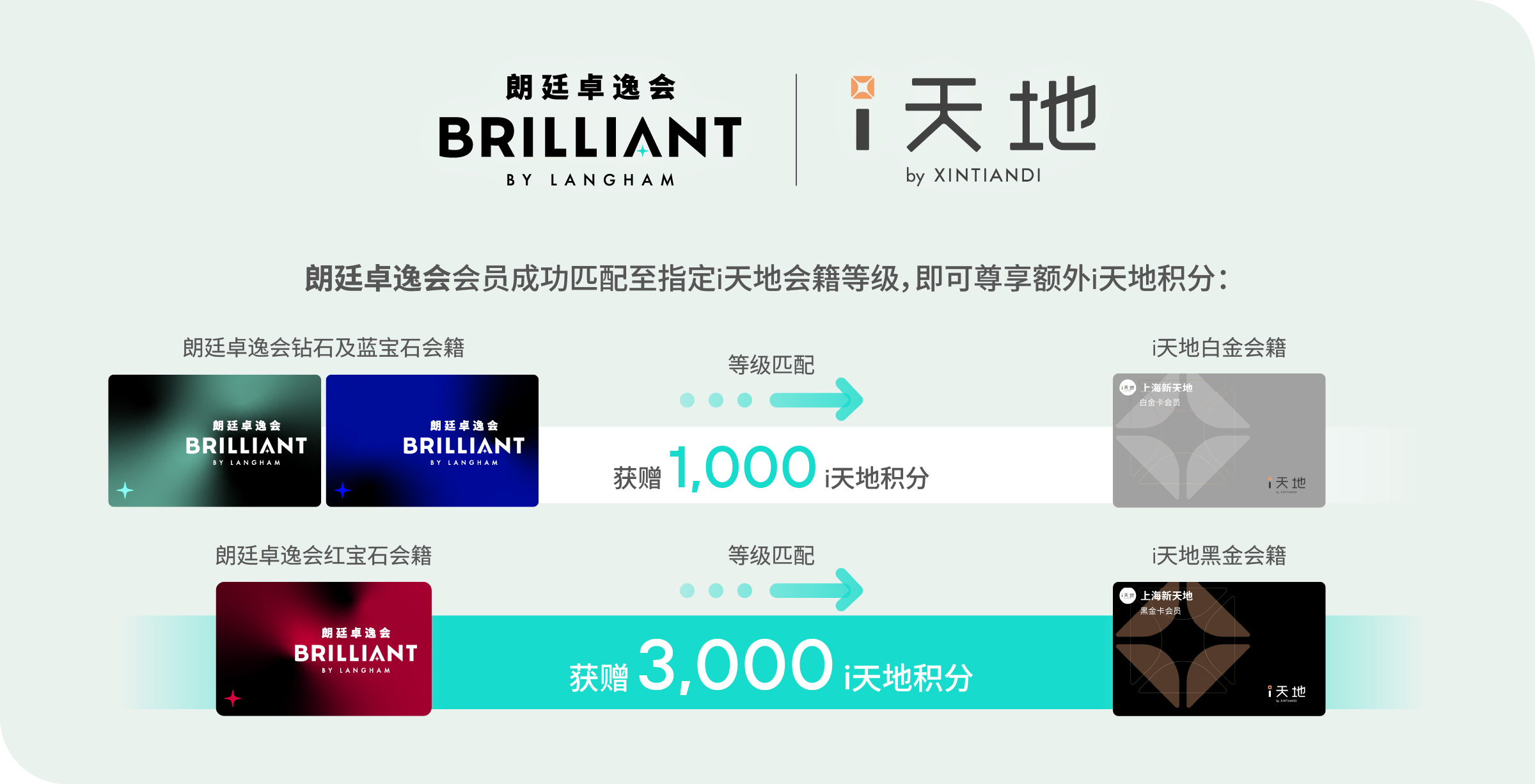 朗廷卓逸会联乘新天地XINTIANDI旗下会员体系i天地,为会员推出会籍等级匹配及迎新奖励积分等双重惊喜礼遇。